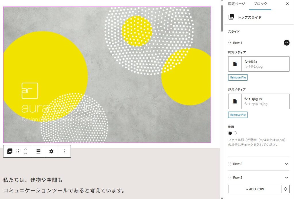 トップページのスライドも、自由に画像や動画を設定可能。更にPCとスマホで別の画像を設定することも出来るよう構築しております。